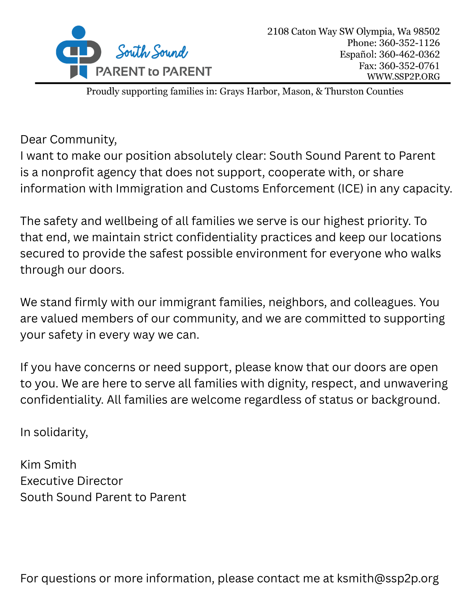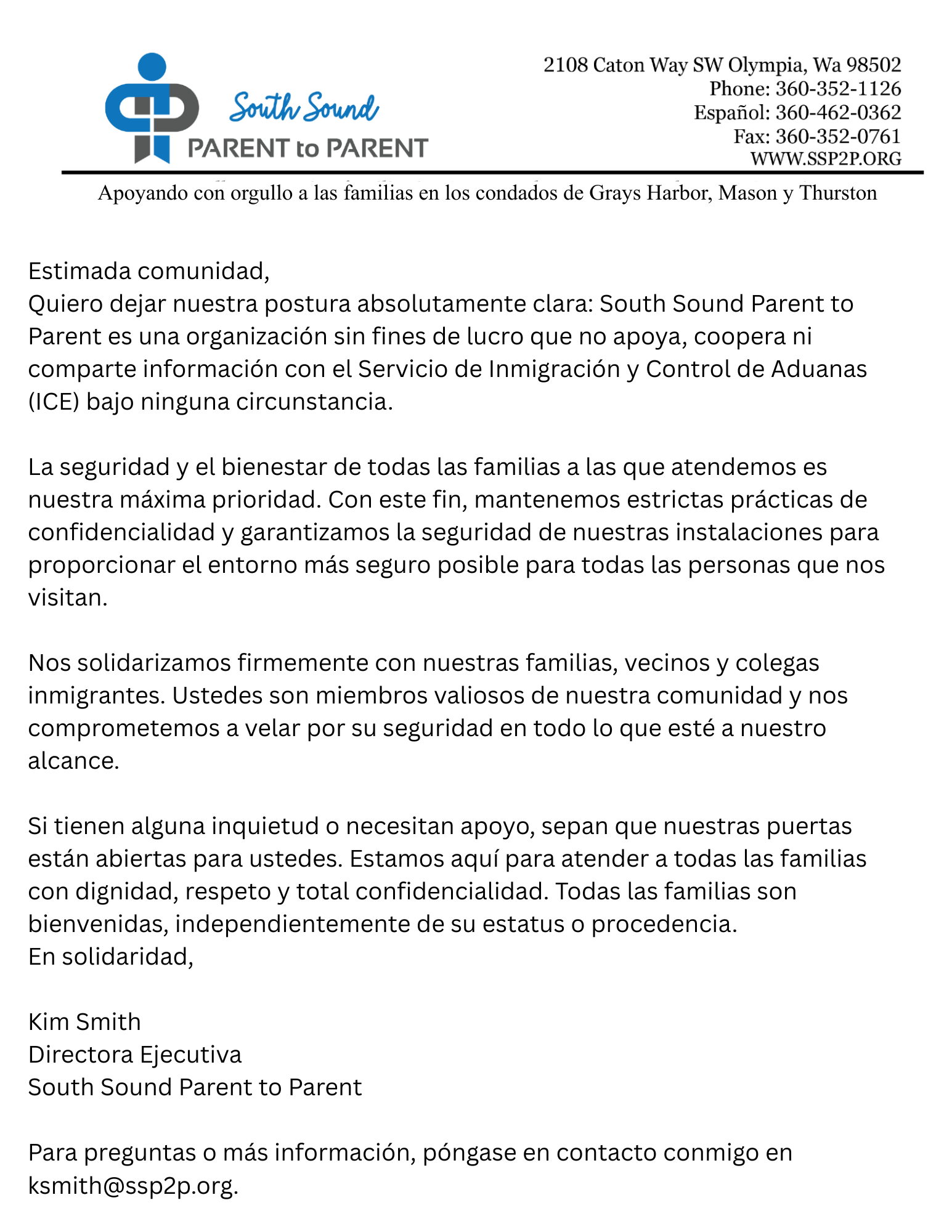 Por favor, haga clic en las cartas a continuación para leer un mensaje importante de la Directora Ejecutiva Kim Smith reafirmando la solidaridad de South Sound Parent to Parent con nuestra comunidad inmigrante y vecinos.