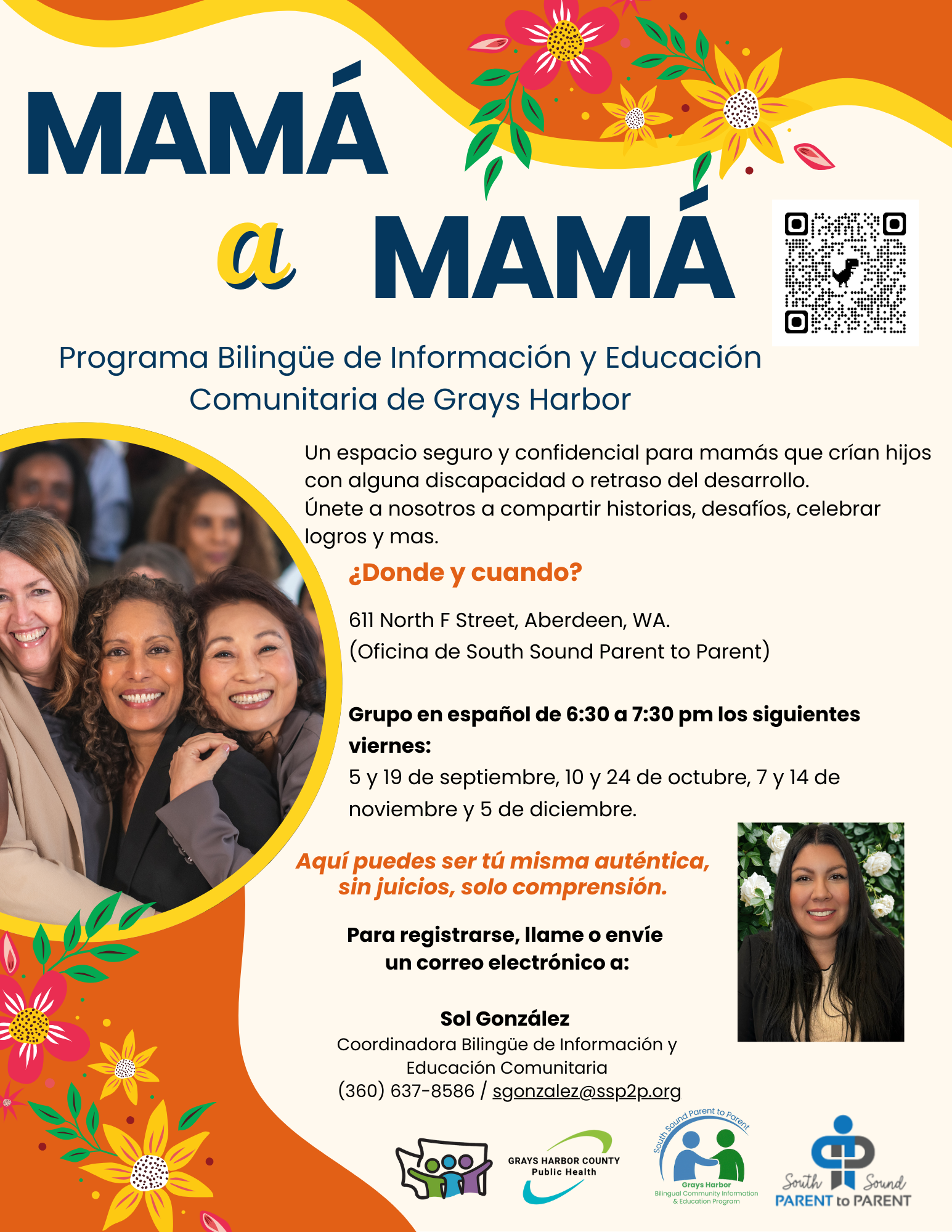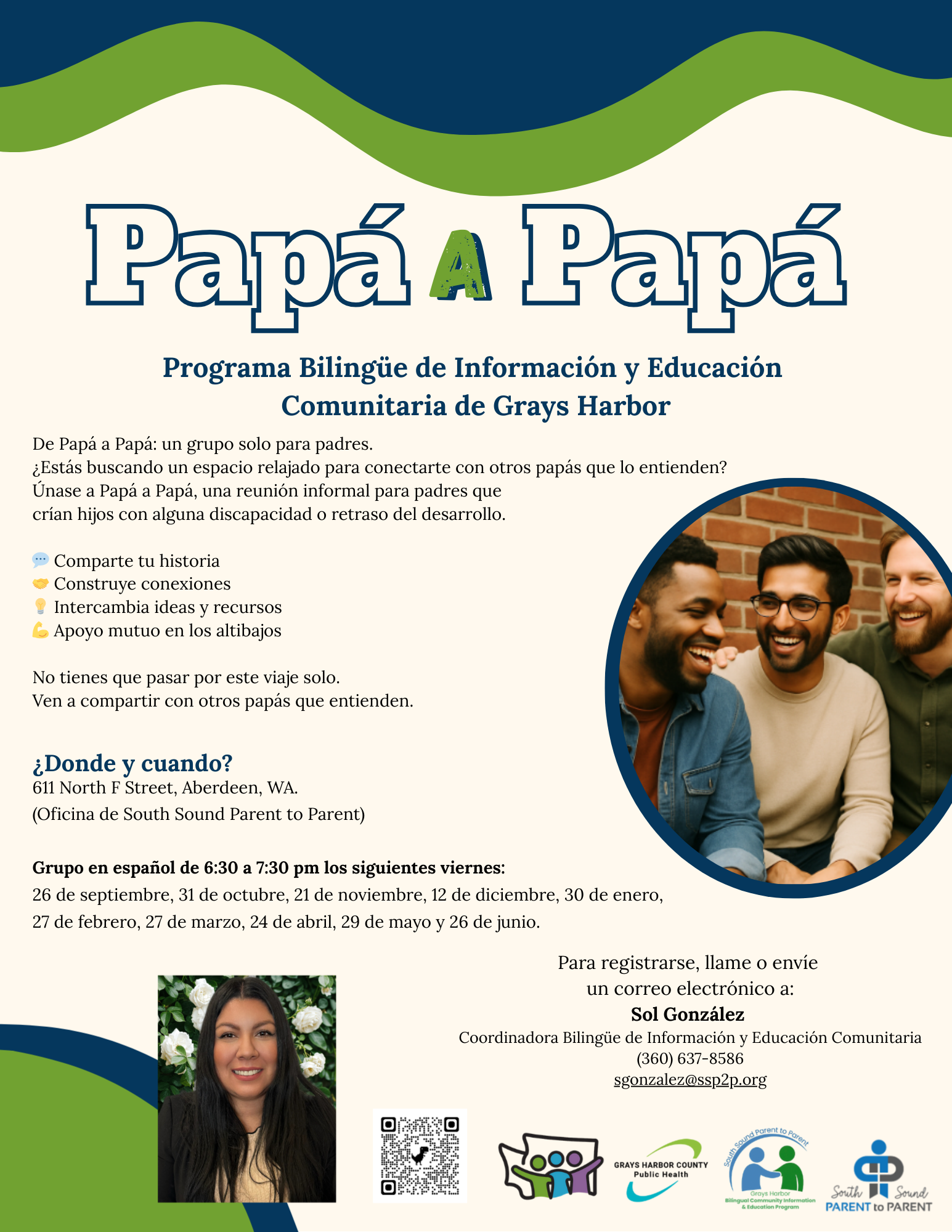 ¡South Sound Parent to Parent está emocionado de traer un nuevo programa a Grays Harbor! El programa bilingüe de información y educación comunitaria es un excelente recurso para familias que están criando a un niño con retraso en el desarrollo o discapacidad. Este incluirá: apoyo emocional, recursos de la comunidad, tutoría entre padres, apoyo con el programa de educación individualizado (IEP) ¡Educación para padres y más!