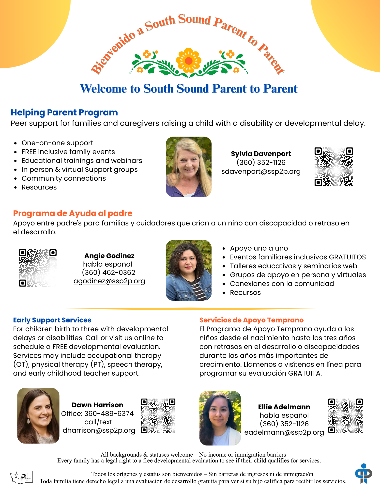 El programa de Padres Ayudantes ofrece apoyo emocional, recursos comunitarios, mentoría entre pares, conexiones sociales a través de eventos familiares DIVERTIDOS, ayuda para navegar sistemas de salud complejos, oportunidades educativas y orientación para padres/cuidadores que crían a niños con discapacidades Criar a un hijo puede ser complicado, solitario y abrumador Como el enlace para las familias que cuidan a un ser querido con discapacidad en nuestra región, South Sound Parent to Parent está listo para brindar apoyo